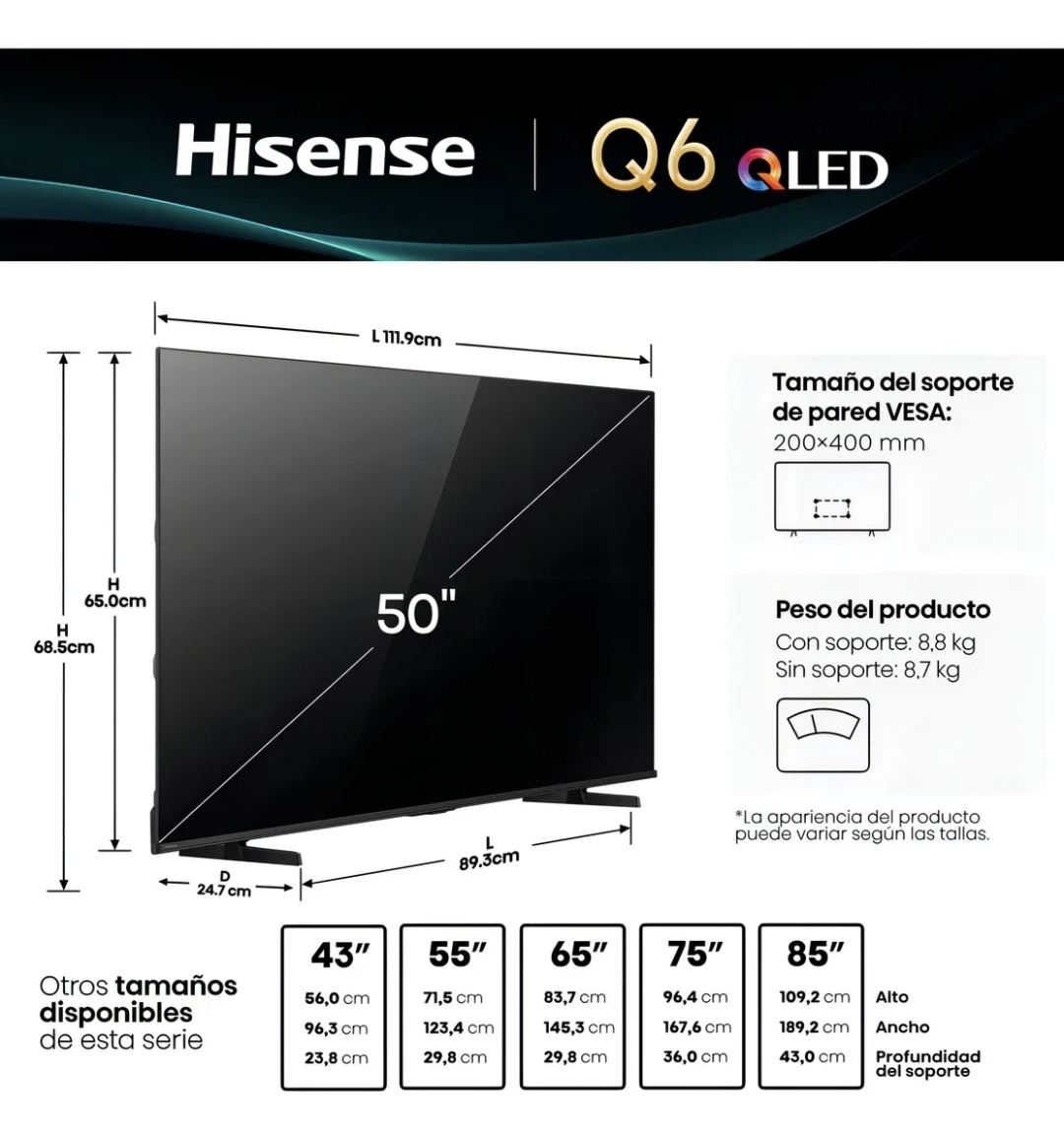 Lleva la experiencia del cine directamente a tu sala con la Hisense Serie Q6QV. Gracias a su tecnología de vanguardia y un diseño elegante sin marcos, este televisor no es solo una pantalla, es una ventana a un mundo de colores vibrantes y detalles asombrosos.