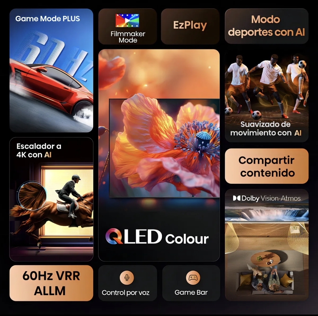- Tecnología Quantum Dot Color: A diferencia de los LED convencionales, los puntos cuánticos ofrecen más de mil millones de tonos, logrando imágenes más realistas y saturadas.